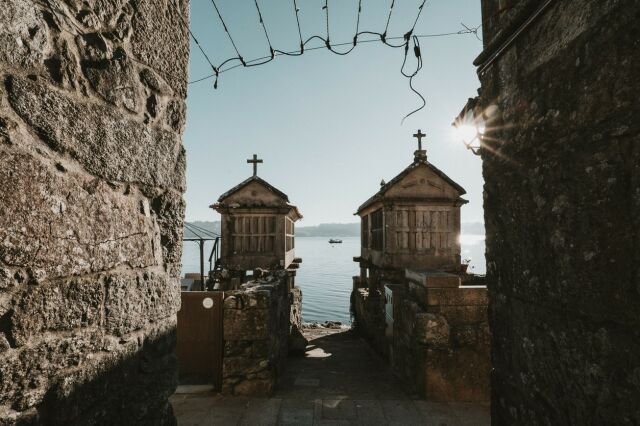 Conjunto histórico de construcciones tradicionales a orillas del mar, utilizadas para almacenar alimentos en la antigüedad. Muy fotografiadas en Galicia.