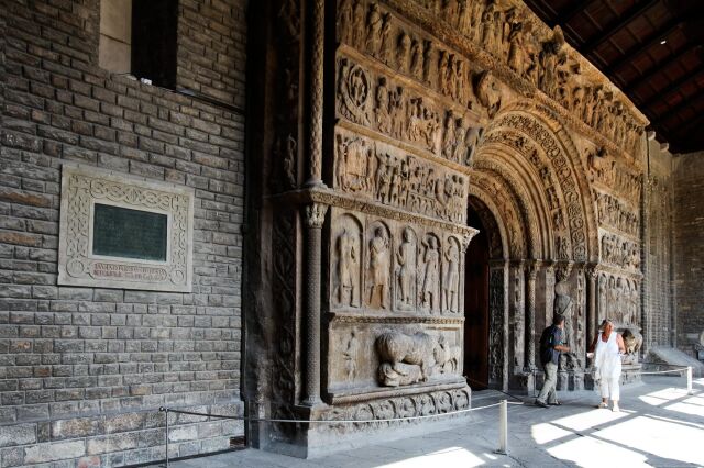 Hoy nos hemos levantado con ganas de montaña. Para empezar con energía optamos por un esmorzar de forquilla en el que algunos se decantan por la butifarra con seques y otros por una carne de caza estofada en la que sería delito no mojar pan. Después del desayuno nos acercamos al monasterio de Santa María de Ripoll para ver de cerca este magnífico símbolo de la Catalunya medieval, fundado en el año 879. Su portada monumental, compuesta por toda una miríada de motivos geométricos, estructuras vegetales y personajes labrados en gres —la llaman la biblia de piedra— merece una detenida contemplación.