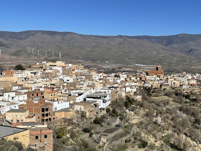 Un encantador pueblo en la provincia de Granada, con calles estrechas, casas blancas y un majestuoso castillo que ofrece vistas panorámicas.